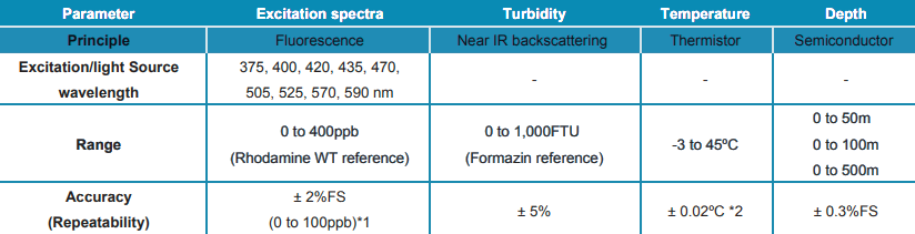 Multi-Exciter es un fluorómetro de excitación múltiple para la detección automática de clase de algas. Está equipado con una sonda de fluorescencia de clorofila con LED de excitación de 9 longitudes de onda para medir espectros fluorescentes, un medidor de turbidez y un sensor de temperatura y profundidad.